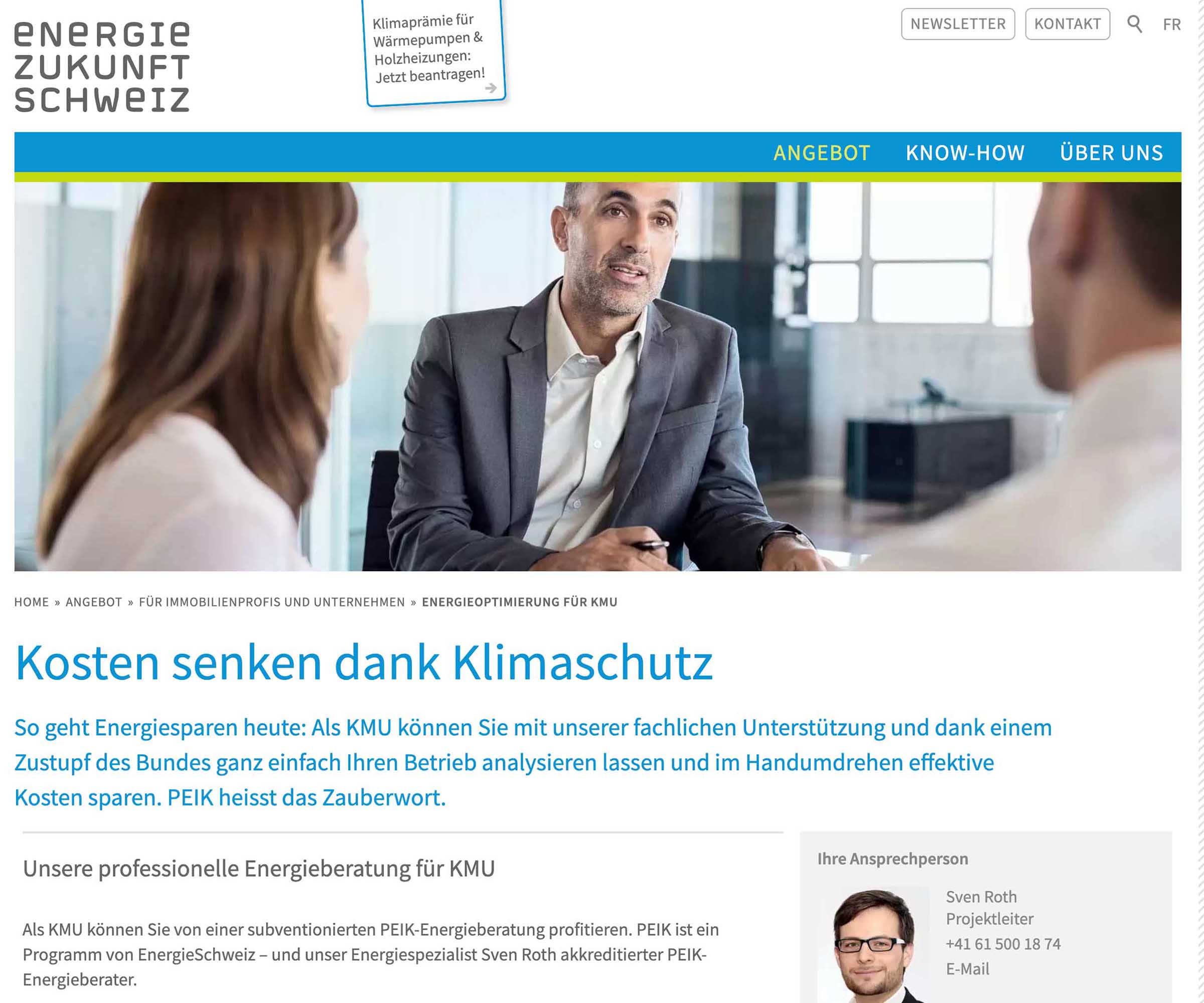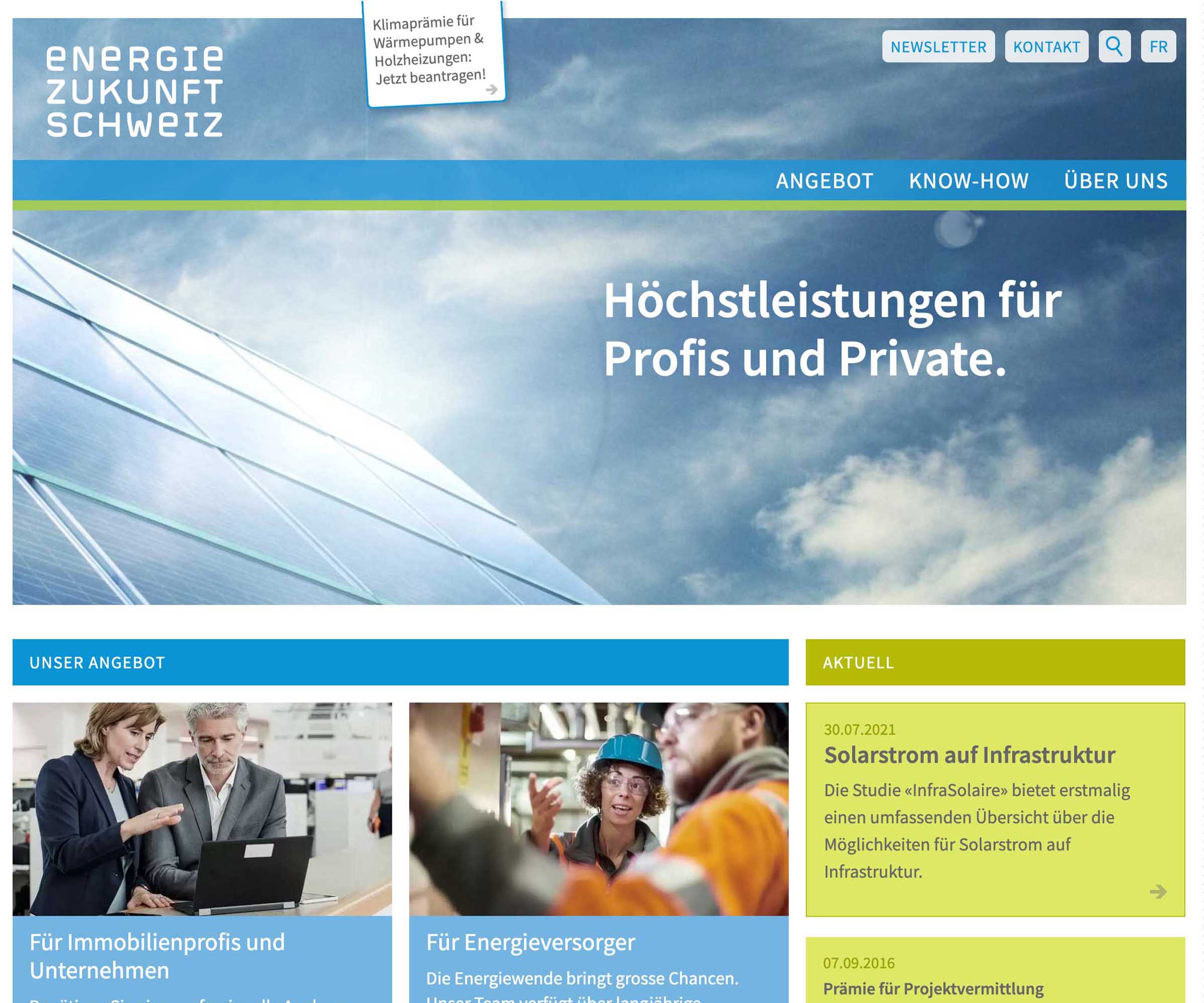 Mit Energie Zukunft Schweiz verbindet unsere Agentur eine langjährige Zusammenarbeitauf verschiedener Ebene. So setzte unsere Agentur einen Relaunch des umfangreichen Webauftritts um, der sowohl die Konzeption als auch die Inhalte und Gestaltung betraf. Ziel war es, mit überschaubarem Aufwand deutliche Verbesserung der Usability und eine Auffrischung in der Gestaltung zu erreichen. Dies gelang innerhalb einer Umsetzungszeit von nur zwei Monaten.